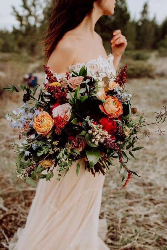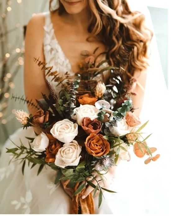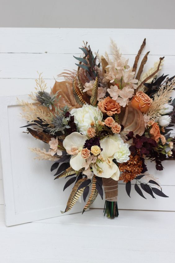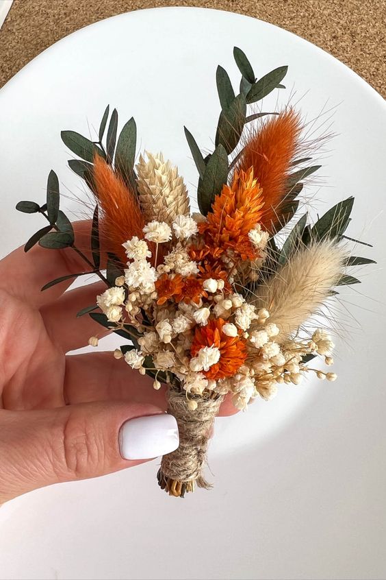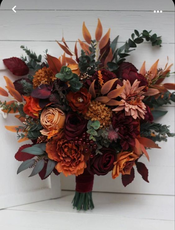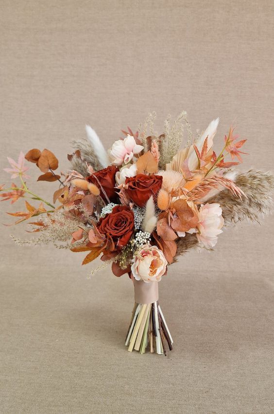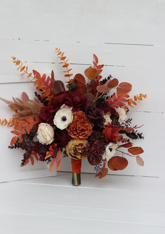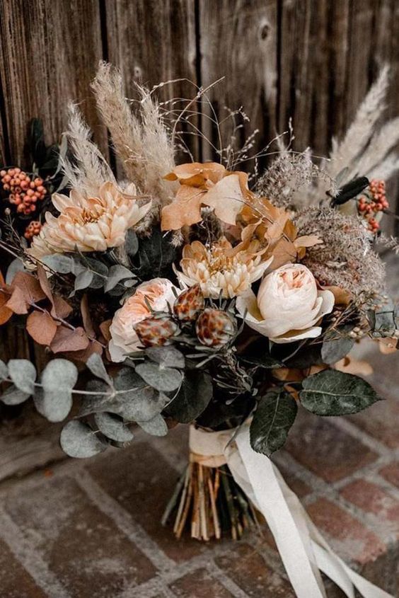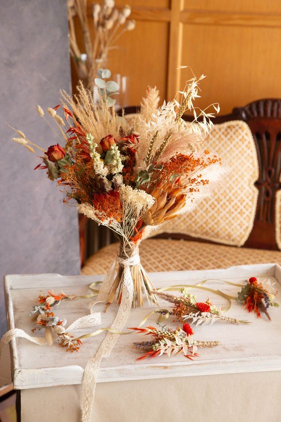 Jesenná svadobná kytica by mala ladiť s výzdobou svadobného priestoru. Ideálnou voľbou sú sušené kvety či obilie, ktoré môžete skombinovať so živými kvetmi. Jesenné kytice môžete navyše doplniť o farebné lístie, ktoré podčiarkne jesenný nádych vašej svadby. Odvážnejšie nevesty môžu siahnuť po kytici ozvláštnenej eukalyptom a bavlnou, pri svadbách v neskoršej jeseni dokonca šiškami či ihličím.